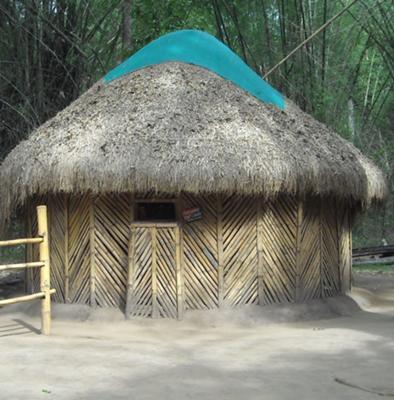 The idea struck my brother and we started the design and construction and completed it in just three months. This round cottage has a radius of four meter and has mud flooring with two cots and a chair inside all made of bamboo.