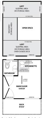 And two loft areas that can be used for sleeping or storage. Plus a small deck with rails outside.